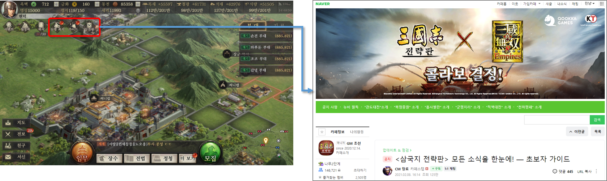 - 때문에 아래와 같이 인게임 버튼이 즉시, 커뮤니티 사이트로 이동(네이버 카페)